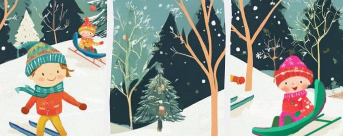 Pred vami je partia šťastných detí, ktoré si v lese užívajú sneh a pravé zimné počasie. Tie najmenšie sa sánkujú a ich starší kamaráti lyžujú.