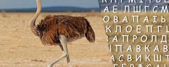 Slovo „pštros“ je ukryté medzi chaoticky umiestnenými písmenami.