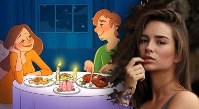 Na obrázku vidíme romantickú večeru zamilovaného páru. Chlapec a dievča sedia pri stole a obdivne sa na seba pozerajú.