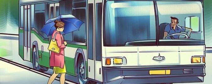 Na obrázku vidíme ženu, ktorá nastupuje do autobusu. Vonku je daždivé počasie, preto drží v ruke dáždnik, aby sa chránila pred zrážkami.