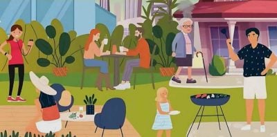 Pozrite si obrázok nižšie. Zobrazuje scénu vonkajšej párty. Ľudia na obrázku trávia čas oddychom, rozprávajú sa a grilujú.