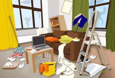 Pozrite sa na obrázok vyššie. Zobrazuje obývaciu izbu, ktorá potrebuje generálne upratovanie. Na podlahe a na nábytku sa povaľuje oblečenie, vankúše na pohovke sú zrazené z miesta a na stene sa krčia obrazy. V strede miestnosti sa nachádza aj rebrík, vedro a gumené rukavice, čo naznačuje, že majitelia domu sa zaoberajú generálnym upratovaním.