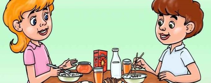 Na obrázku vidíme dievča a chlapca, ktorí sedia pri stole a jedia, pričom sa o niečom vášnivo rozprávajú.