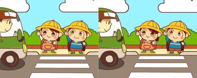 V ďalšej hádanke musíte nájsť tri rozdiely medzi obrázkami dvoch školákov, ktorí stoja na priechode pre chodcov a pozerajú sa na prechádzajúce auto.