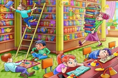 Na obrázku vidíme knižnicu, v ktorej niektoré deti čítajú knihy a niektoré hrajú stolové hry. Knihovníčka nesie veľké množstvo kníh, ktoré má uložiť na police.