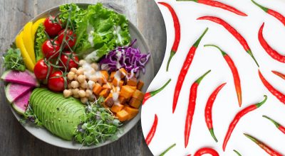 Na fotografii je zobrazený plný tanier, na ktorom vidíme nakrájanú a celú zeleninu, zeleninu a strukoviny. Takýto výdatný tanier však skrýva jedno „prekvapenie“ – niekde v ňom je ukrytá čili paprička, ktorú je takmer nemožné spozorovať.