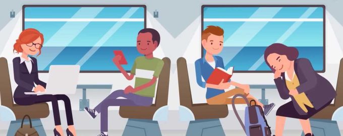 Na obrázku sú znázornení štyria ľudia vo vlaku, pričom každý z nich robí niečo iné.